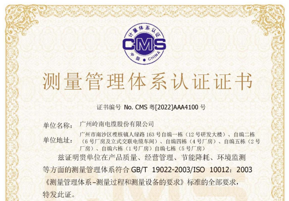 近日,sunbet申搏控股公司广州岭南电缆股份有限公司(以下简称“岭南电缆”)测量管理体系顺利通过认证审核,荣获AAA级“测量管理体系认证证书”,标志着岭南电缆在产品质量、经营管理、节能降耗、环境监测等方面的...